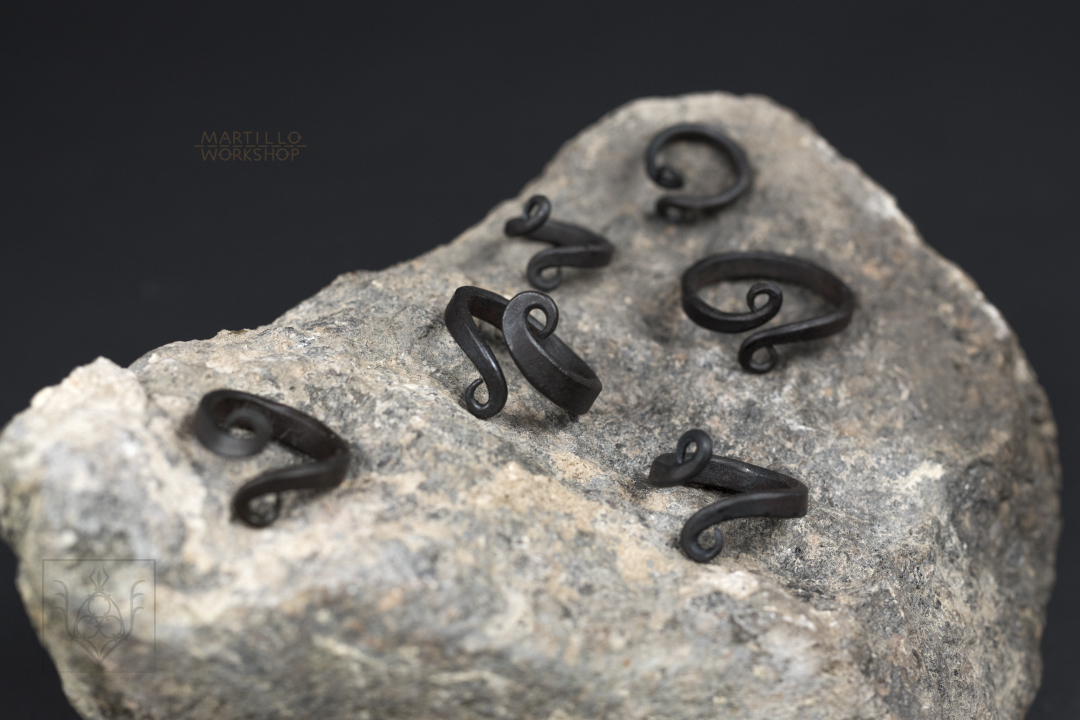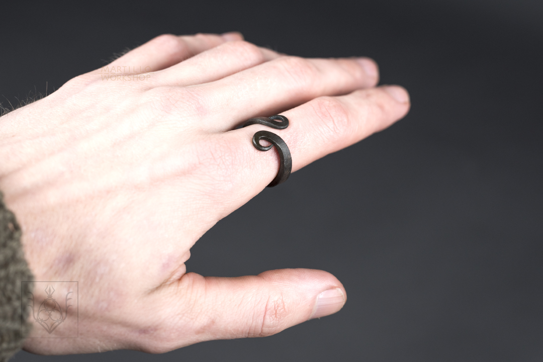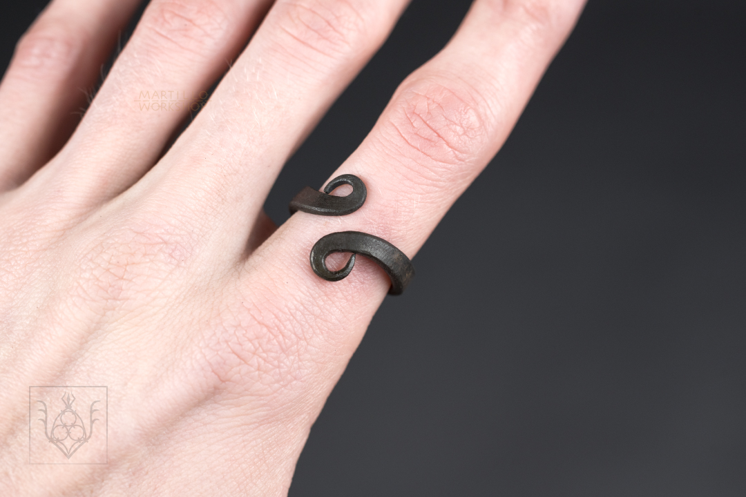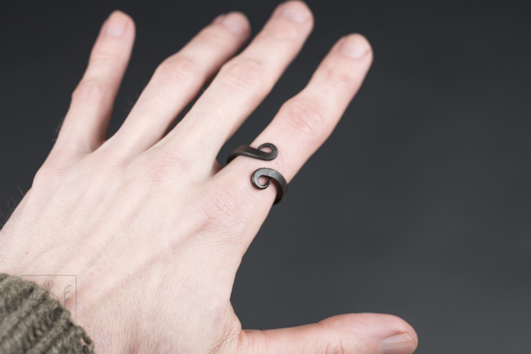 The scrolls on the swirly ring is hand forged in my blacksmith workshop in Denmark. Rustic, but made with careful precision. Each ring will have some natural variation in shape and finish.