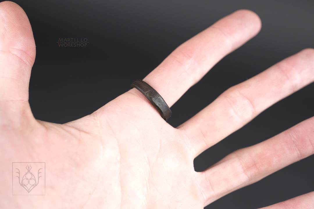 Every ring has a forged finish and is treated with raw linseed oil – this is a foodsafe finish that darkens the ring a bit and prevents rust. Once the ring has been worn for a bit, your skin’s natural oils will keep it from rusting. Should you ever wish to re-finish the ring, you can do so by applying a very thin layer of vegetable oil and heat it in an oven at 220-250 Celsius for 30-50 minutes until the oil is black and dry to the touch – very much like you would treat castiron cookware.